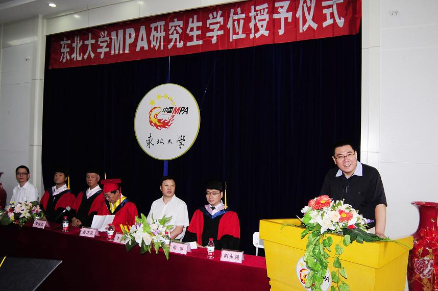 院长张雷首先在典礼上致辞,他代表学院全体教师对完成学业、顺利取得学位的同学表示热烈的祝贺。讲话中,张院长对近期铁路动车追尾等重大事件进行分析,指出新的形势下公民对政府管理的要求越来越高,希望MPA研究生同学们在走出校门后,能牢记东北大学“自强不息,知行合一”的优良传统,努力践行“博学、笃行、敬业、奉公”的MPA理念,勤于思考,踏实工作,为辽宁服务型政府的建设做出自己的贡献。